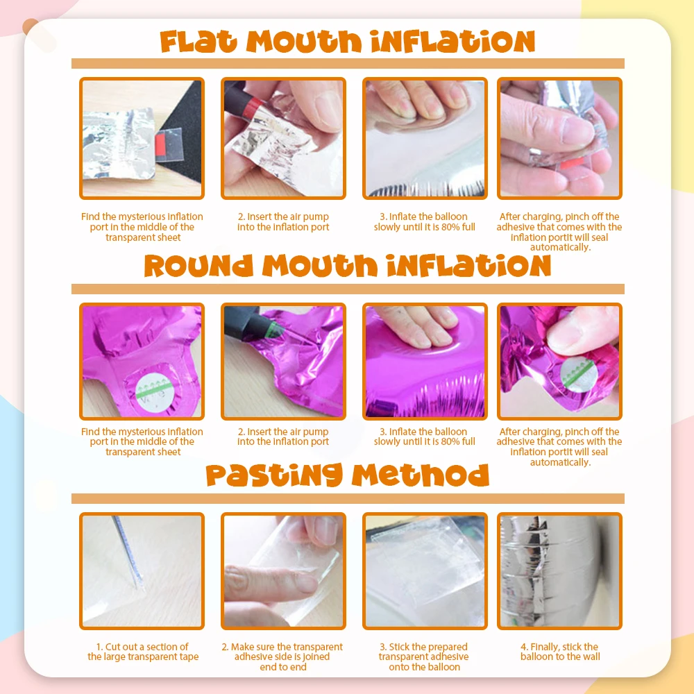 1.Find the mysterious inflation port in the middle of the transparent sheet / 2. Insert the air pump into the inflation port / 3. Inflate the balloon slowly until it is 80% full / 4.After charging, pinch off the adhesive that comes with the inflation portlt will seal automatically.